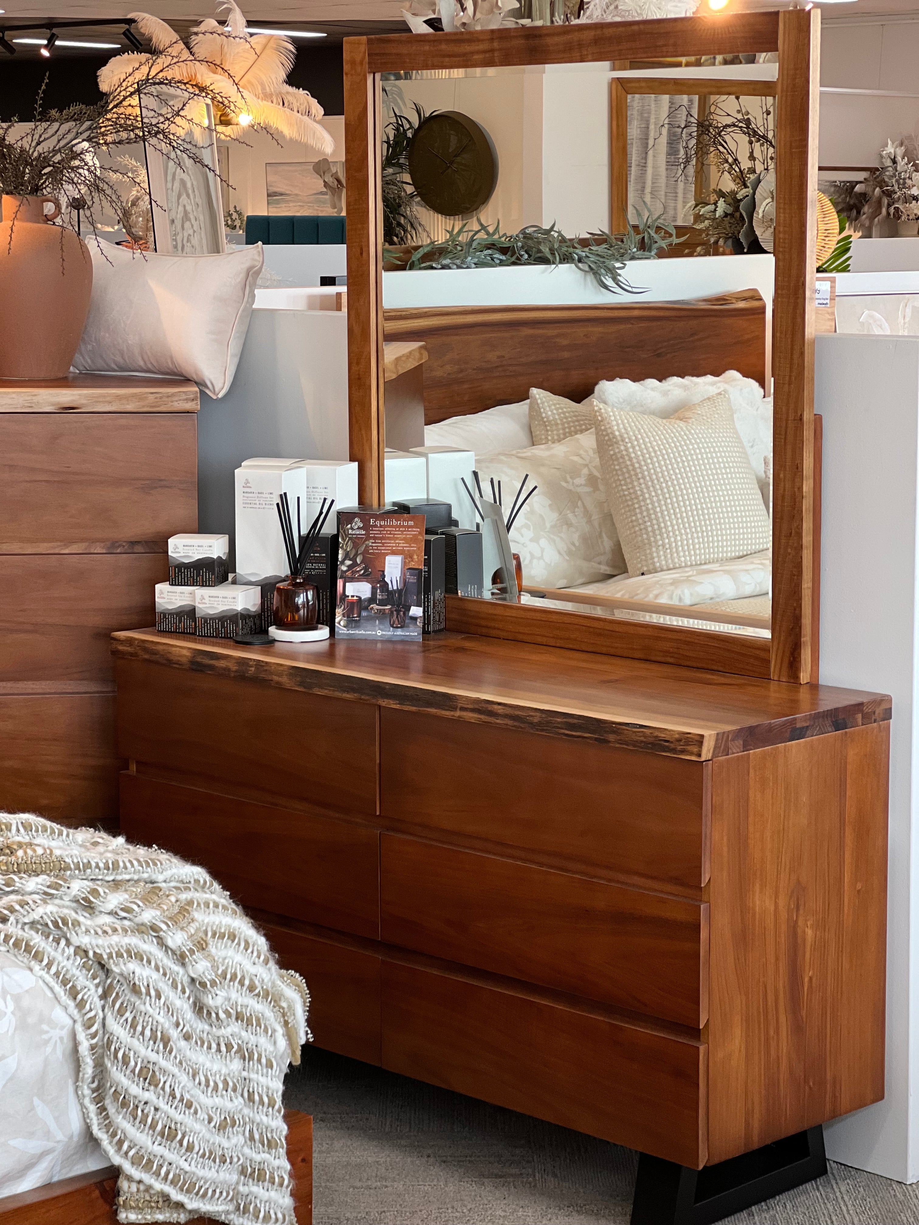 Discover the timeless allure of the “Fortitude” Collection, featuring dresser and mirror sets crafted from Tasmanian Blackwood. Immerse yourself in the captivating blend of light and dark hues, accentuated by unique live edge detailing.