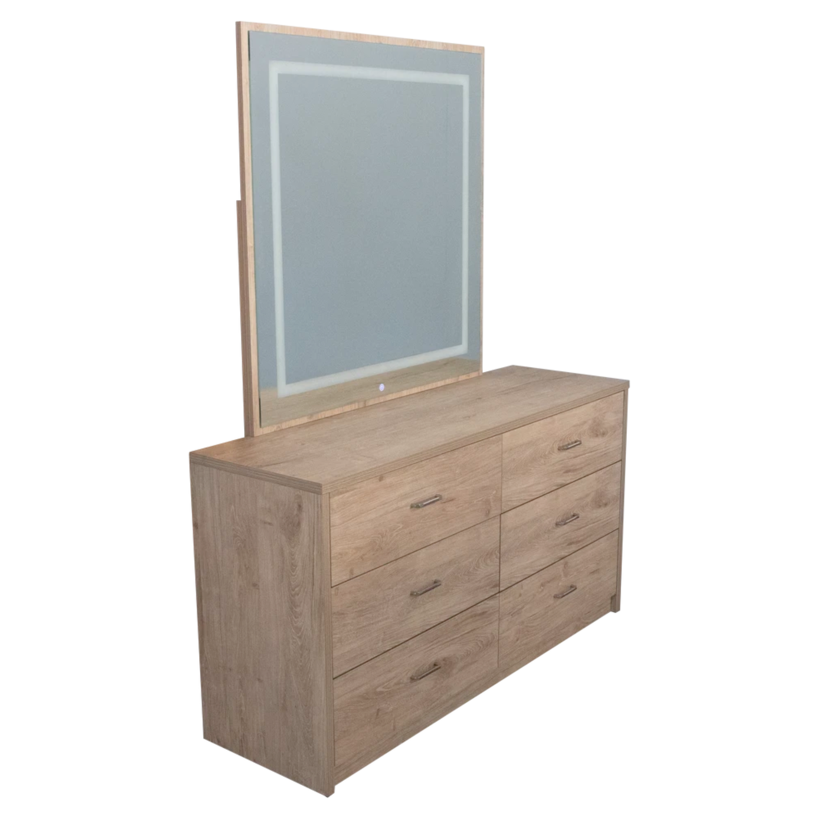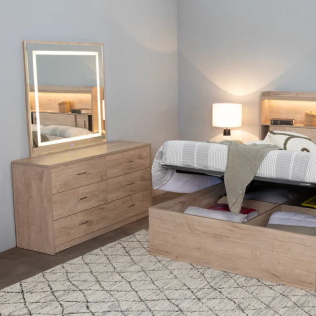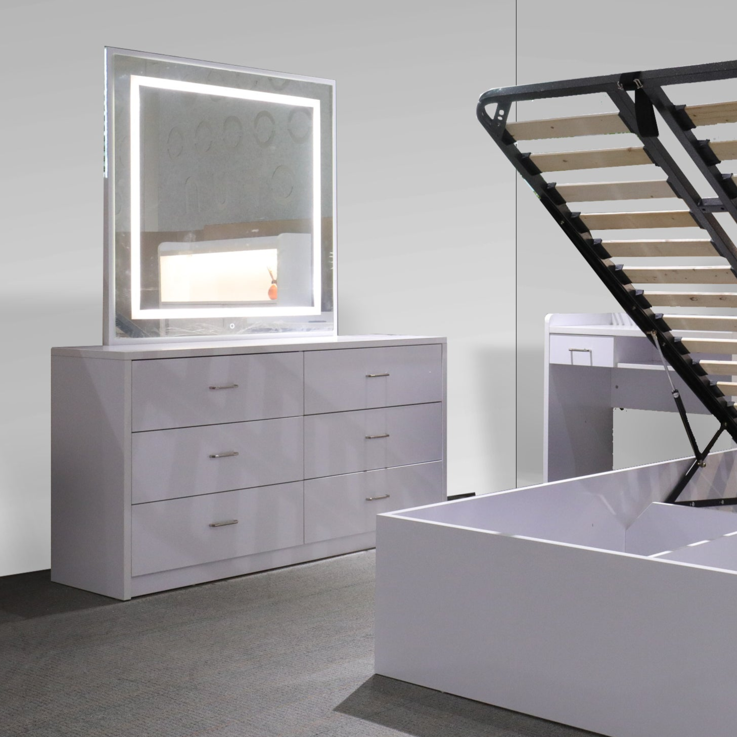 The dresser offers six full-sized drawers with smooth metal runners—perfect for storing clothing, accessories, and more. Paired with a matching LED-backlit mirror, it adds a soft, ambient glow that’s ideal for both mornings and evenings.