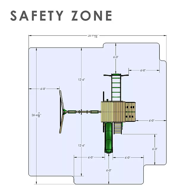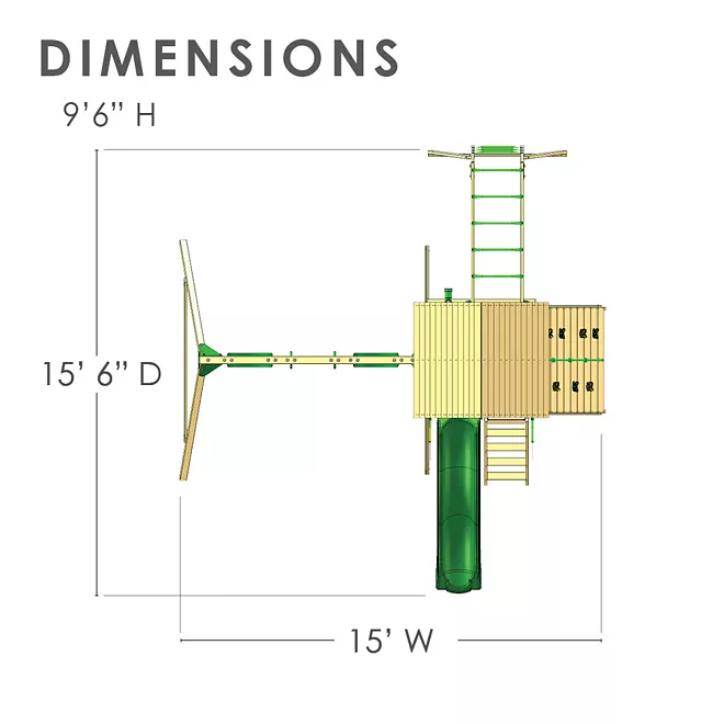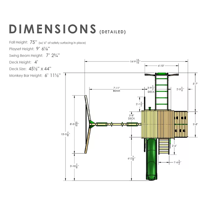 - Safe entry ladder, 2 belt swings, trapeze swing, built-in sandbox area