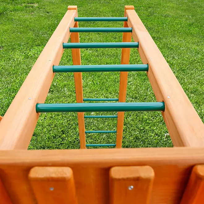 - Monkey bars with heavy-duty metal rungs increase motor skills and strength