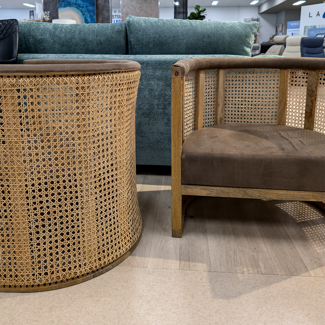 Enhance your space with our large sturdy cane tub chair, featuring a soft fabric seat for added comfort. Measuring 60cm W x 70cm D x 70cm H, this versatile chair blends natural elegance with durability. Ideal for any dining or living area, it brings a stylish, rustic touch to your home decor.
