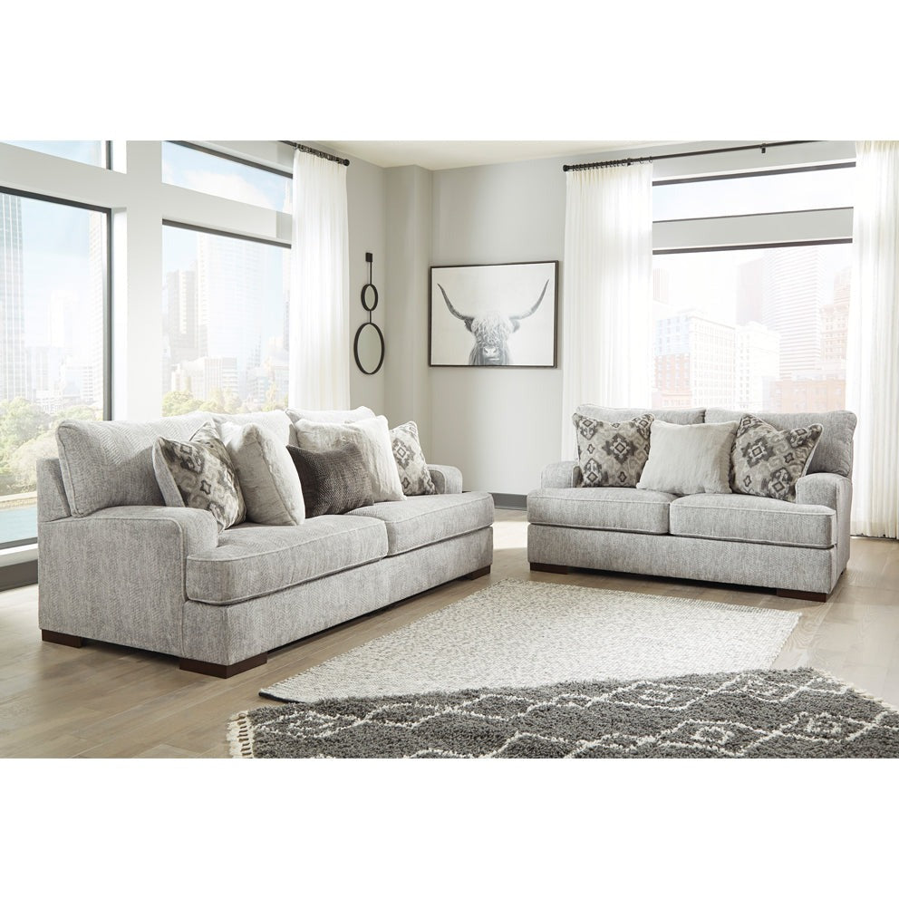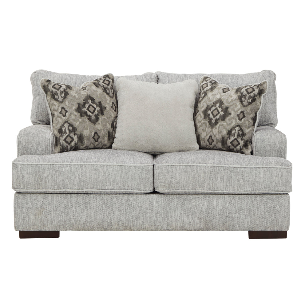 Corner-blocked frame, plush reversible cushions, high-resiliency foam, polyester upholstery, 5 decorative pillows with soft polyfill, exposed feet with faux wood finish, durable platform foundation resists sagging 3x better than springs, maintains smooth, wrinkle-free appearance.