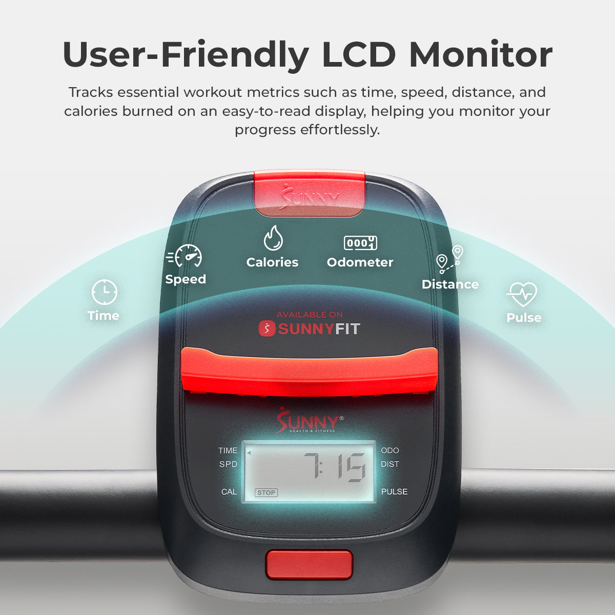 The Sunny Health & Fitness Manual Treadmill combines manual operation with portability, making it ideal for any space without the need for electrical power, thereby saving energy costs. Its sleek, foldable design allows for convenient storage in compact areas such as apartments or home gyms, while ensuring a comfortable workout. This treadmill features dual flywheel and a 14% fixed incline to challenge various muscle groups and enhance the intensity of your workouts, all while operating smoothly and quietly. Track your workout metrics including time, speed, distance, and calories burned on the user-friendly LCD monitor, which can be paired with the optional HR200 heart rate monitor (sold separately) to track your heart rate and steps for more detailed fitness data. The monitor also includes a device holder for your convenience. Connect your treadmill via Bluetooth to the free SunnyFit app to explore over 1,000 workout programs and 10,000 scenic routes. Additional features include a non-slip running surface, soft foam hand grips for added comfort, robust construction for durability, and transportation wheels for easy mobility. With over 20 years of excellence, Sunny Health & Fitness offers a high-quality, dependable addition to your fitness journey.