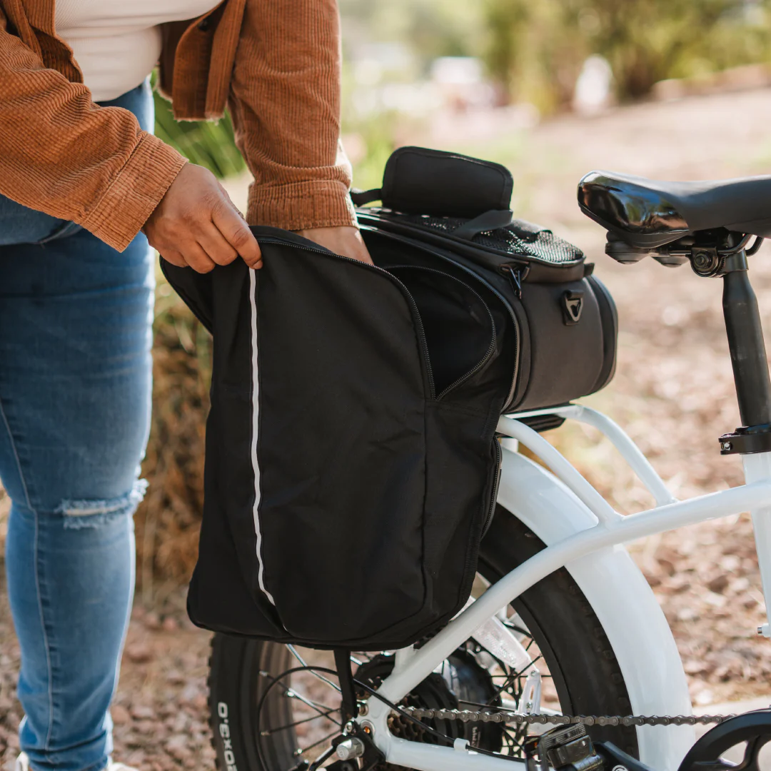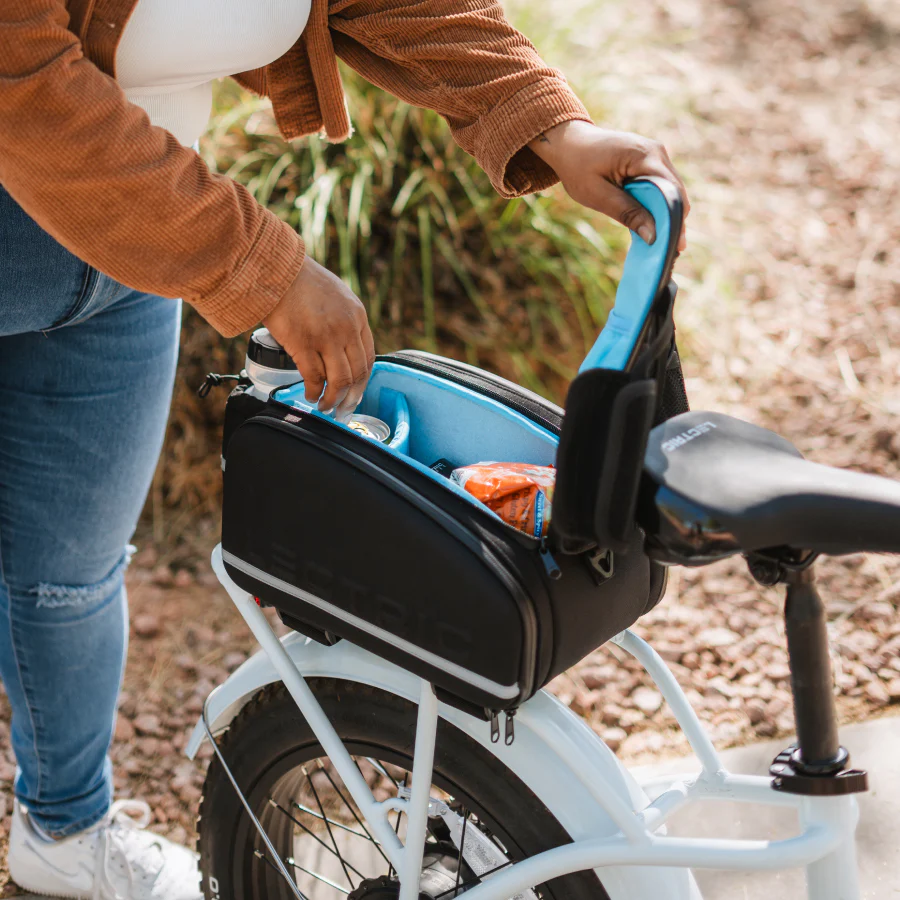 Maximize the storage space on your rear rack with the Trunk Bag! Perfect for storing your on-the-go tools, or packing up a lunch for your picnic in the park. The Trunk Bag comes with a bottle holder sleeve and two roll-up sides to carry anything you might need on your eBike ride!