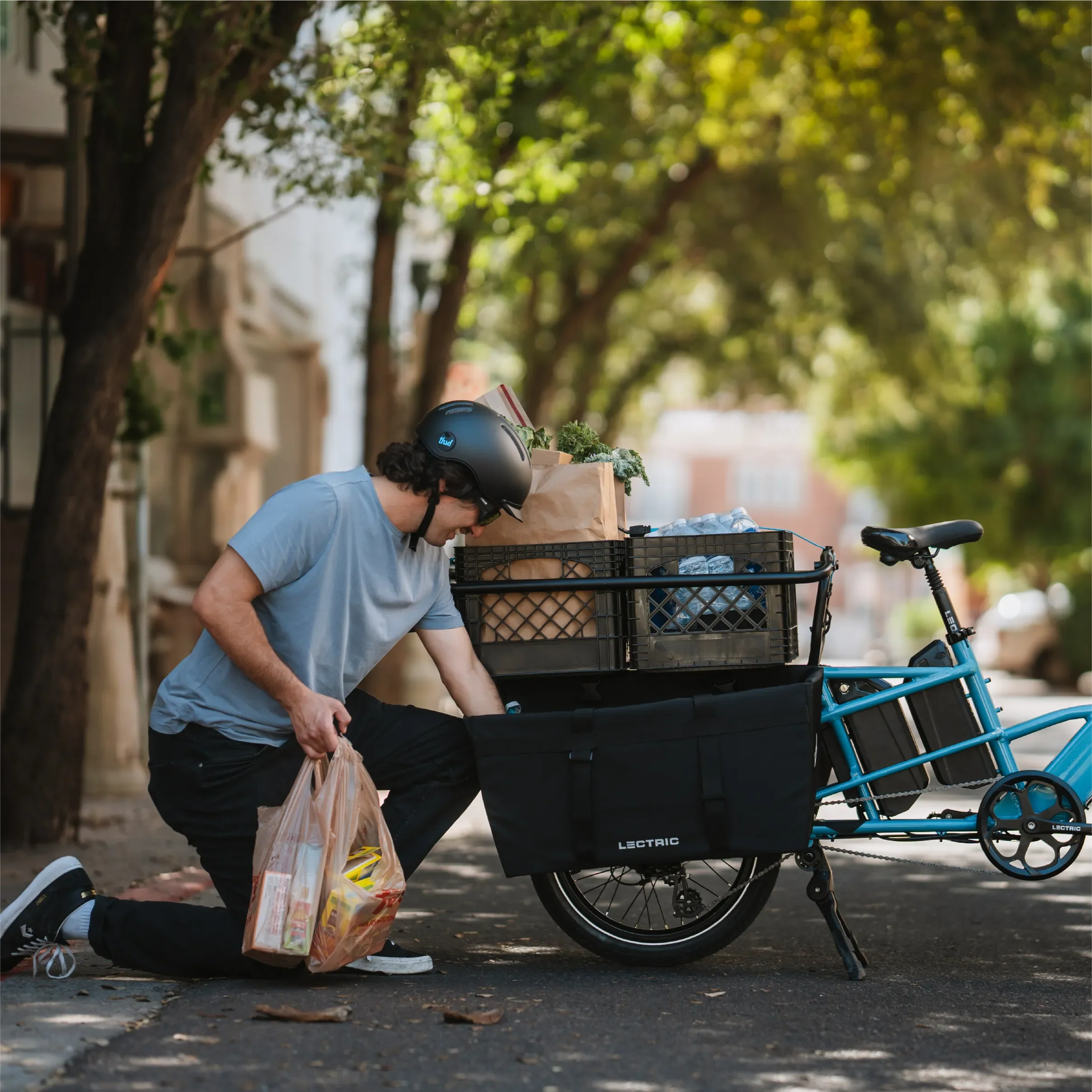 You MUST hold onto the Lectric XPedition whenever loading cargo and/or a passenger. The kickstand is not designed to be used for loading cargo. Do not assume the bike is stable and balanced when using the kickstand. Always hold onto the bike when cargo is being loaded, in place, or attached to the bike.